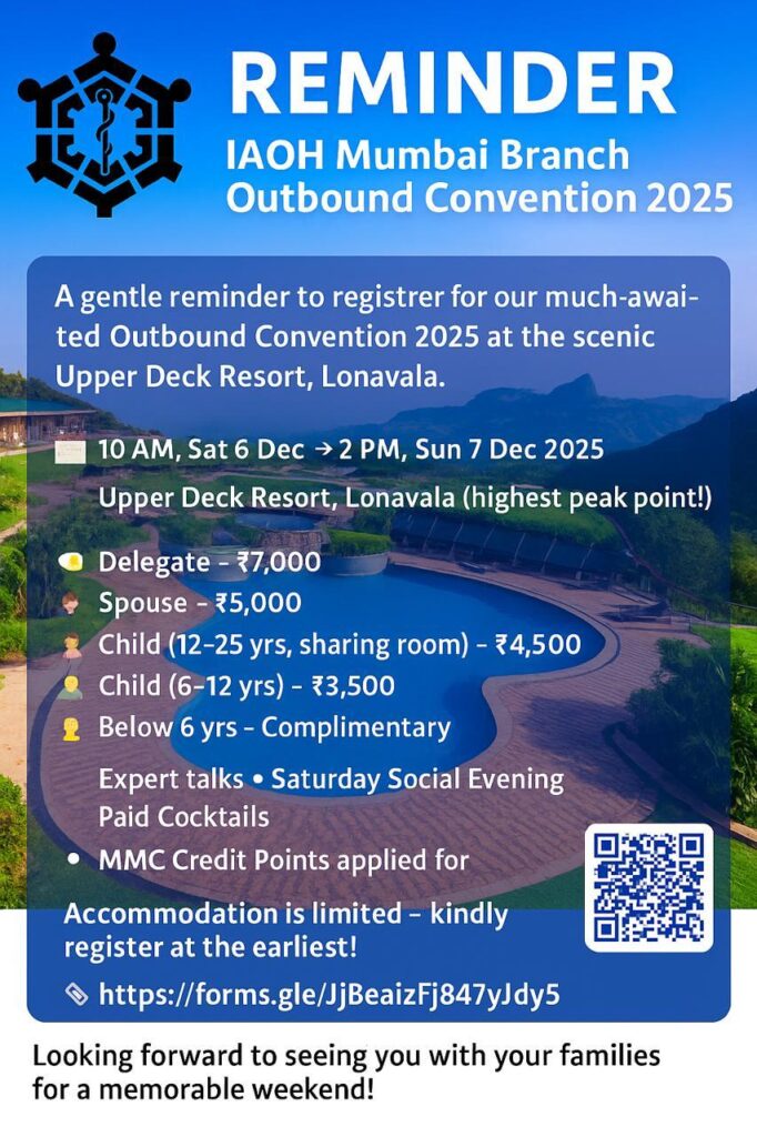 I am humbled and honoured to be the President of IAOH Mumbai branch for a period of two years (2025-27). IAOH Mumbai branch is one of the most active and dynamic branch out of 23 branches contributing in the field of occupational health impacting the health of workers in India.